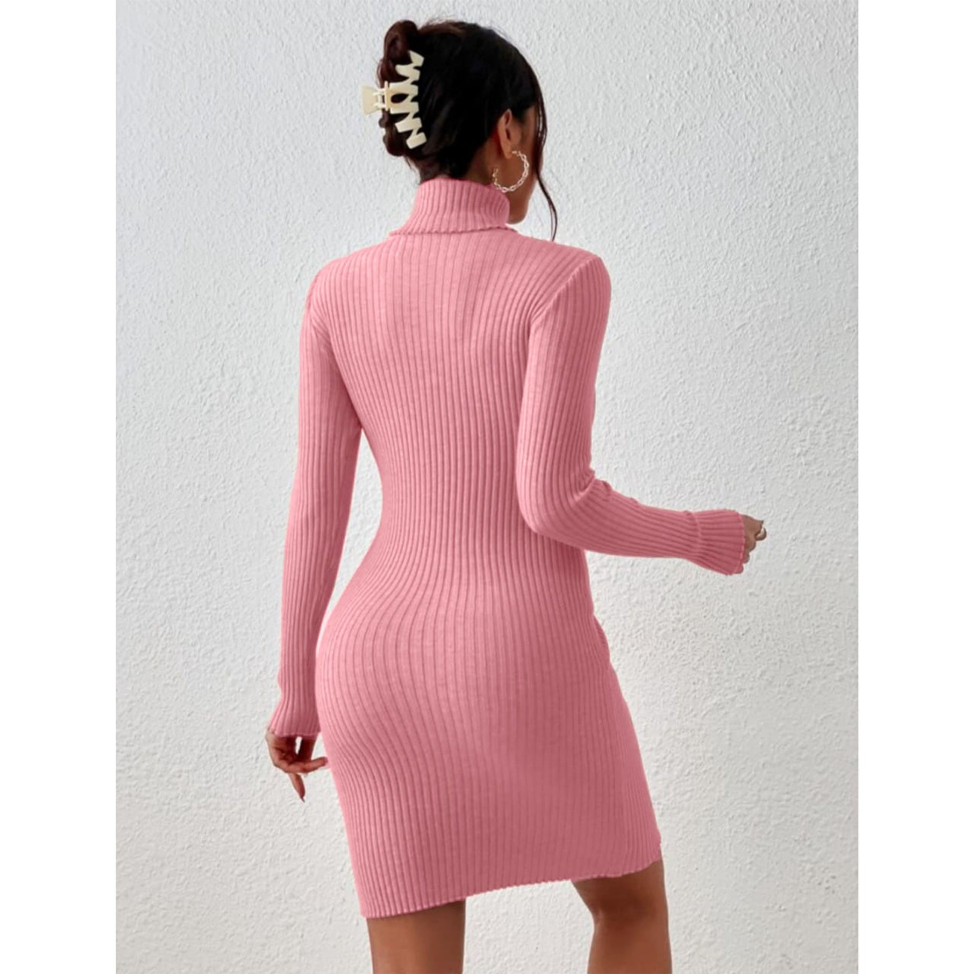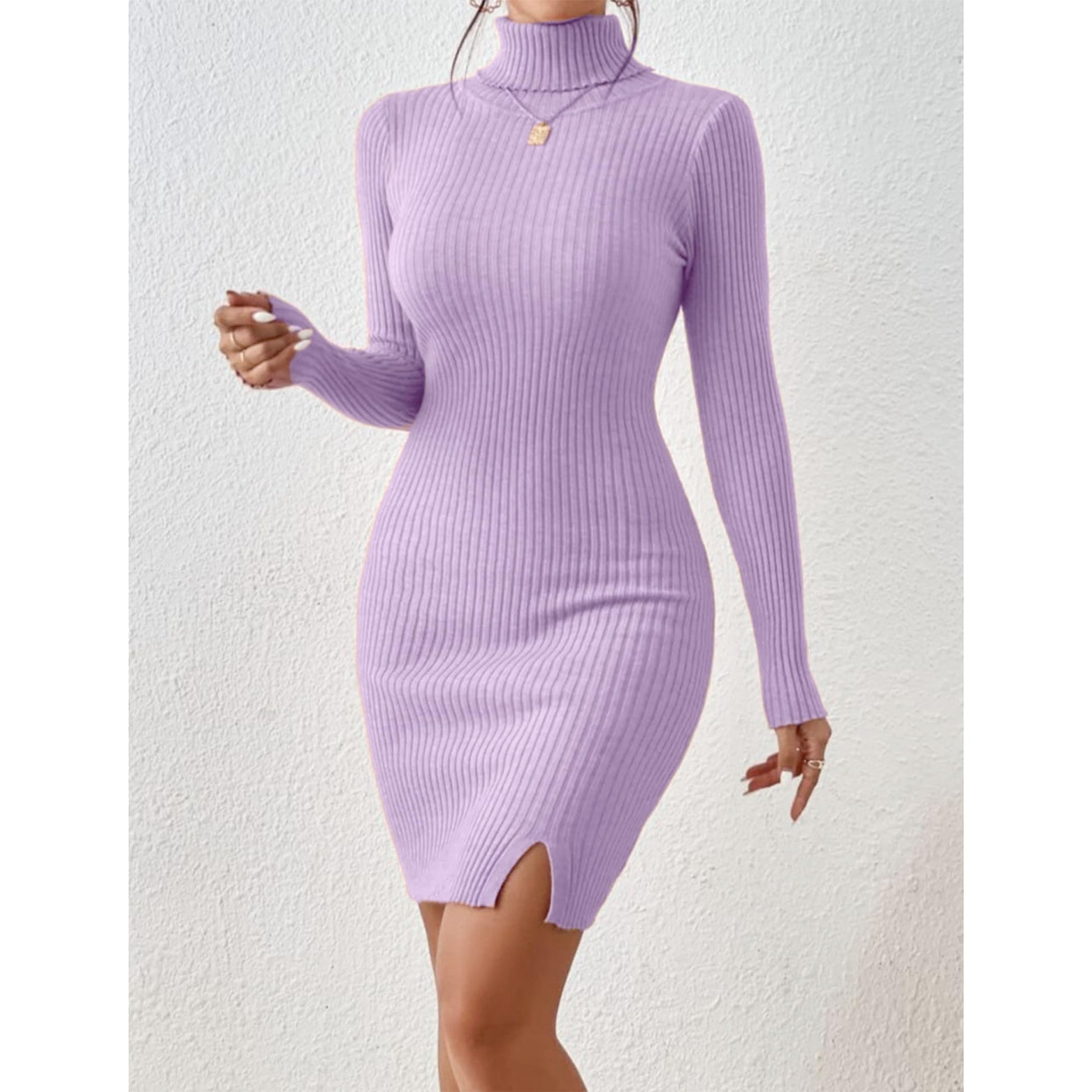 Solid Turtle Neck Regular Fit Casual Ribbed Knit Long Sleeve Bodycon Dress for Women