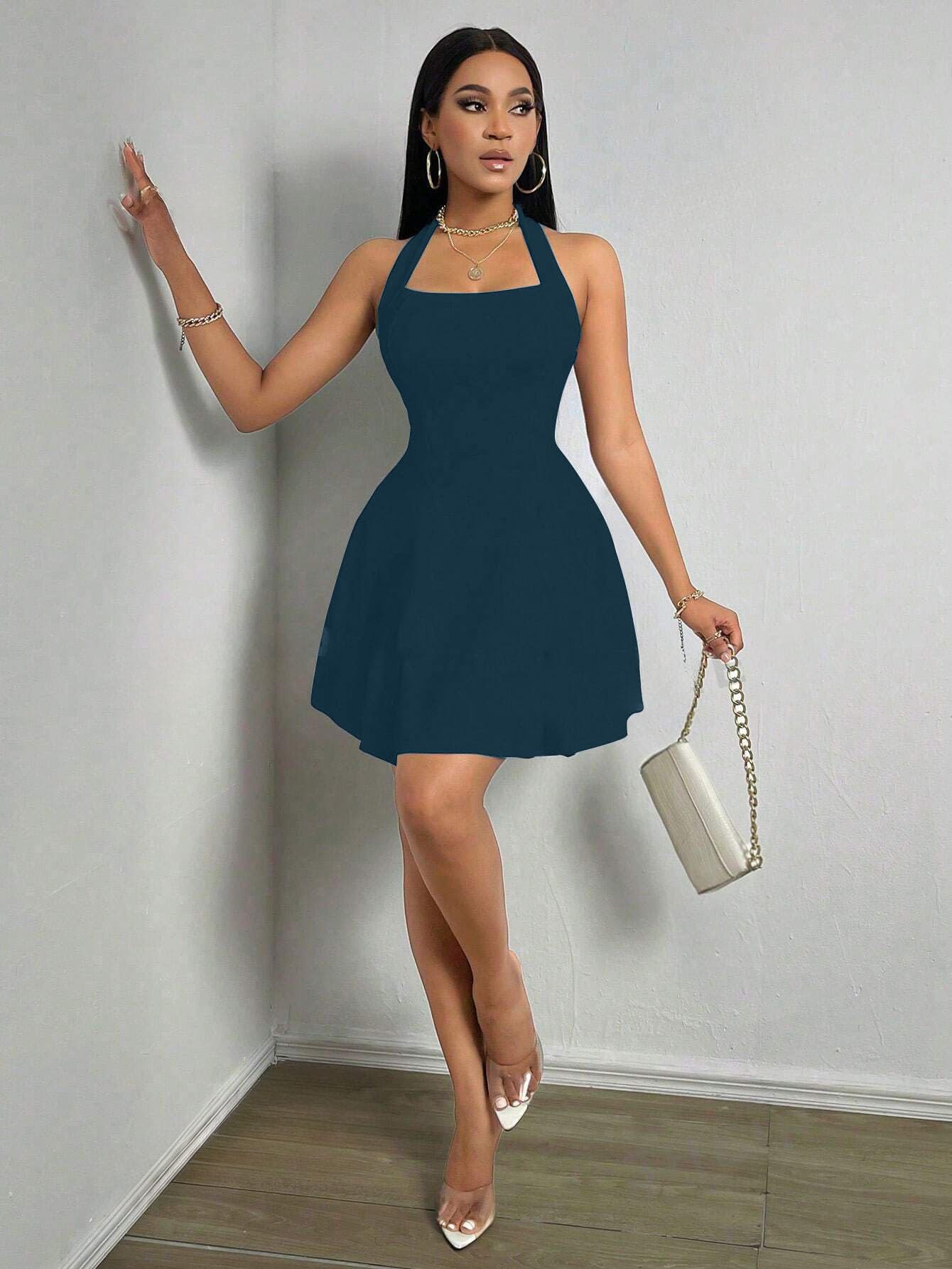 Solid Halter Neck Sleeveless Fit & Flared Mini Dress for Women